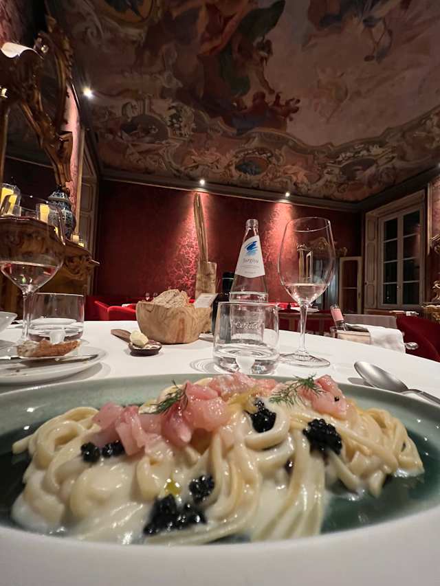 - Ravioli stuffed with Amatriciana sauce, Roman Pecorino cream and crispy guanciale chips