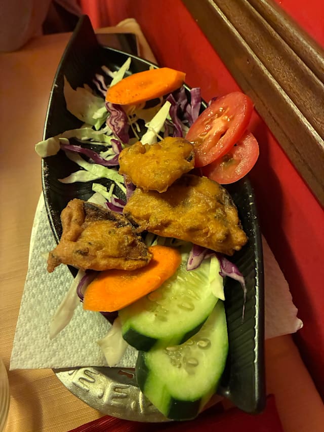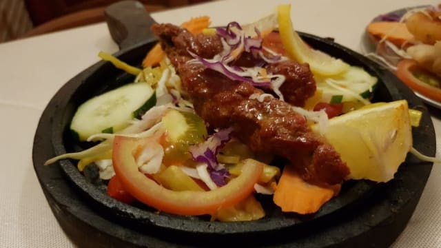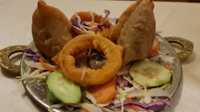Gamberi preparato in famoso stile kashmir servito con erbe fresehe orientali.