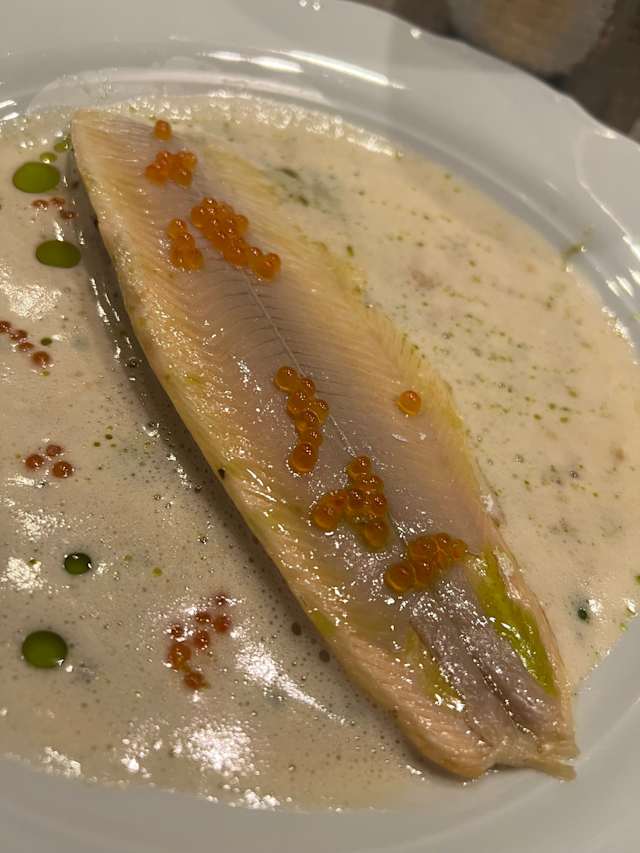 - Ugnsbakad rödingfilé med musselsås, löjrom, basilikaolja.Serveras med citronmarinerad stampotatis.