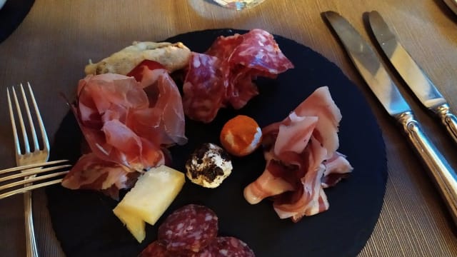 Crudo di Norcia, burrata campana e caponatina di verdure in agrodolce