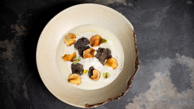 “Le Selvagge” poached egg, cream and chips of Jerusalem artichoke with Taleggio and Norcia black truffle