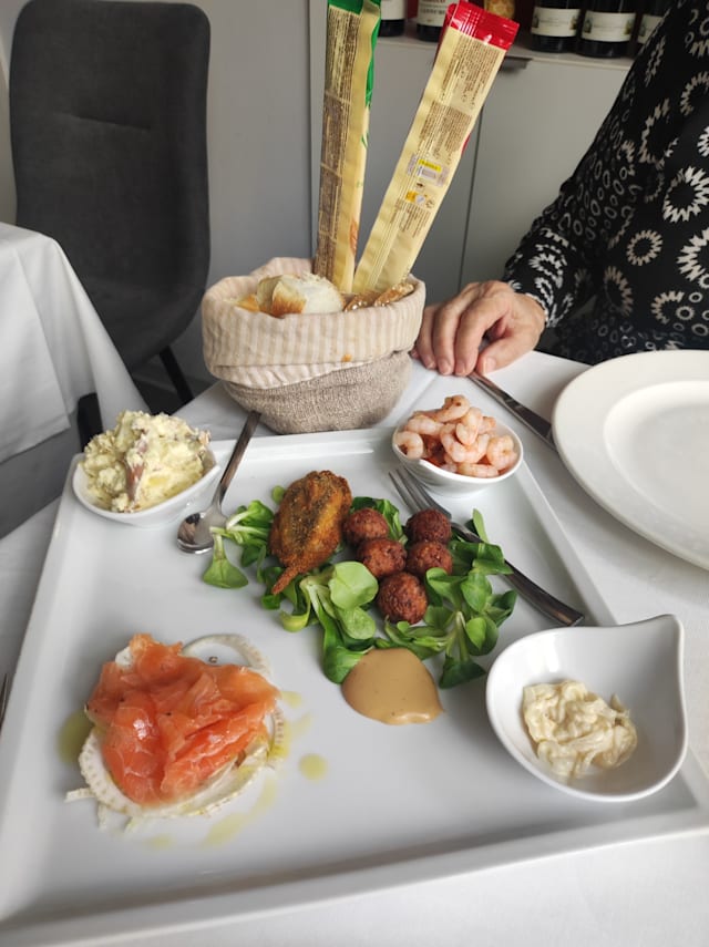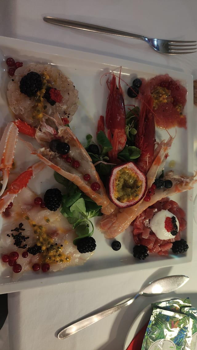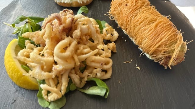 Frittino di calamaretti di paranza, fagottino di pasta sfoglia con capesante in composta di cipolle dolci di tropea, crostini di pane bianco tostato con stracciatella di burrata, vellutata di zucchine romanesche e sgombro atlantico in olio d’oliva