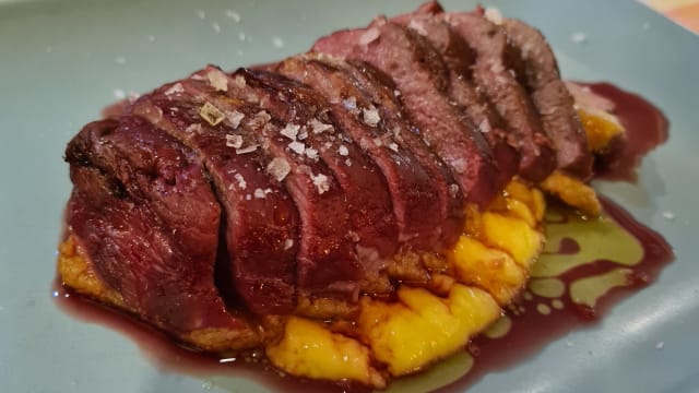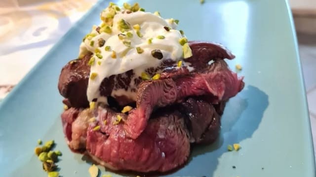 - Tagliata di entrecote di manzo con stracciatella e granella di pistacchio