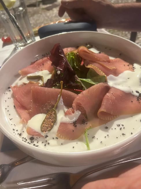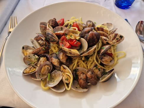10/10Harborside setting. Classical guitar player on "street". Very friendly and efficient service. Best tasting beef carpaccio i have had and large portion split for 2. Thought they gave us a double order. Delicious. Both paccheri with hazelnut pesto and bigoli sarde were hot and delicious. Complementary grappa and limoncello at end of meal. Close tables may lead to conversations with your neighbors. Recommended.
