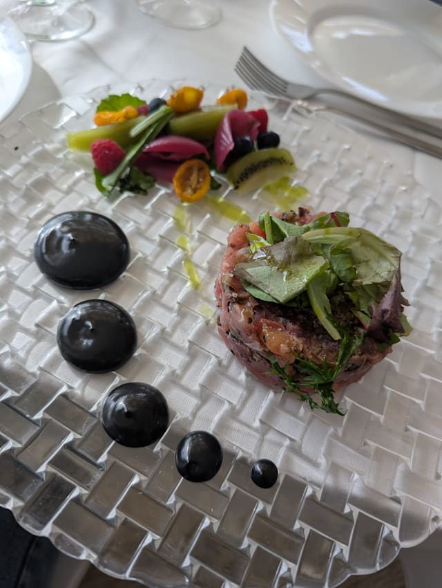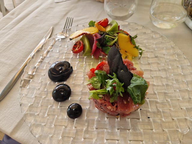 Tartare di tonno accompagnata da maionesi e crudités di frutta e verdura di stagione