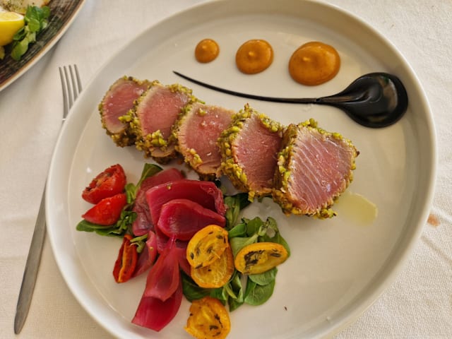 Tagliata di tonno al pistacchio con pomodorini confit, cipolle caramellate e maionesi
