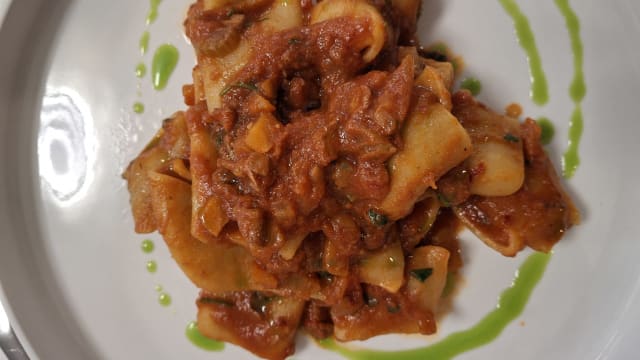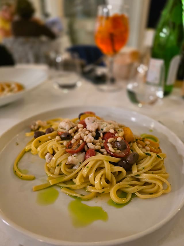 Tagliolino con rana pescatrice, pomodorino confit, olive taggiasche e pinoli tostati