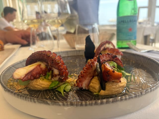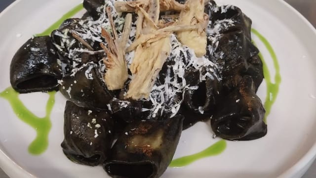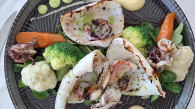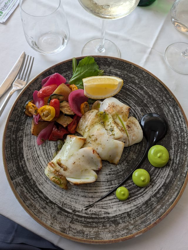Calamaro spadellato accompagnato da giardino di verdure e maio