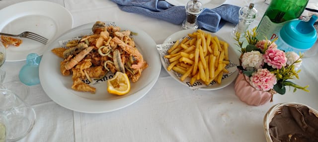 Fritto di calamari, gamberi e acciughe accompagnato da verdure croccanti e salsa tzatziki