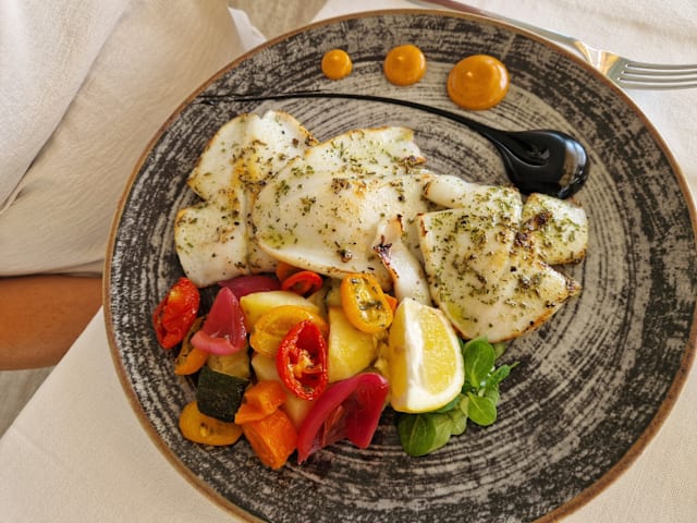 Il miglior pesce pescato del giorno accompagnato da verdure di stagione al forno
