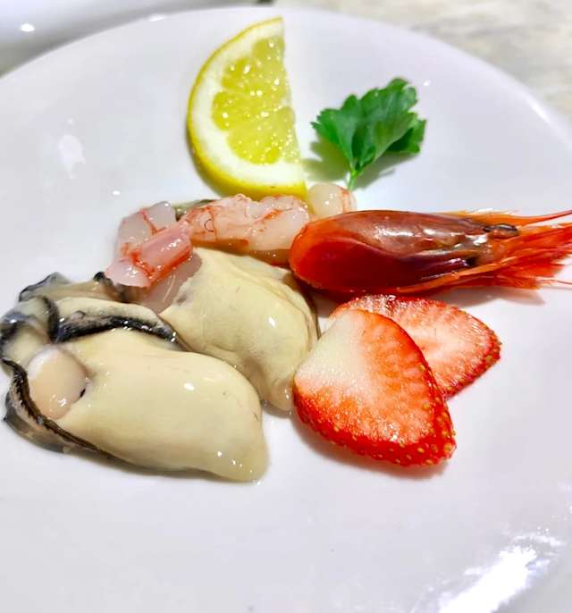 - (ostrica, gambero rosso, prosecco)