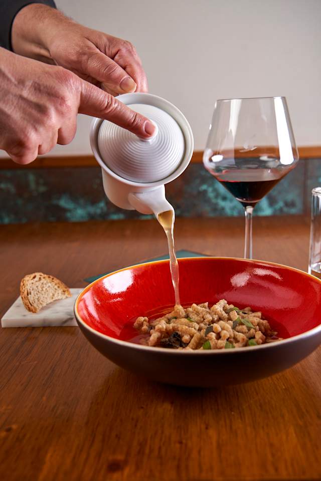 - Tortello di ricotta di pecora e ortica, brodo di verza e tartufo nero