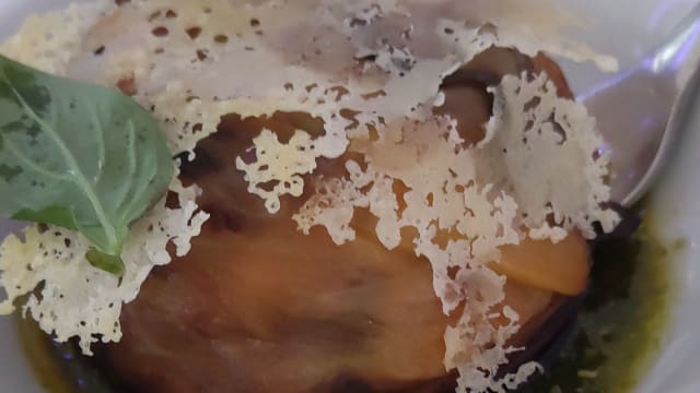 Aubergine parmigiana with buffalo mozzarella and basil sauce