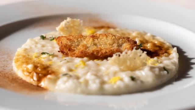 Risotto “riserva san massimo”alla creme fraiche, erba cipollina e sautè di cosce di rana