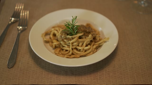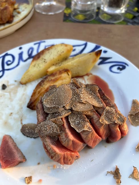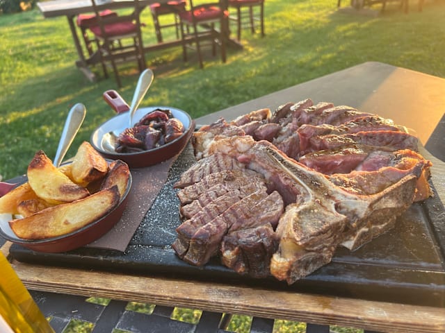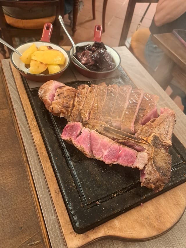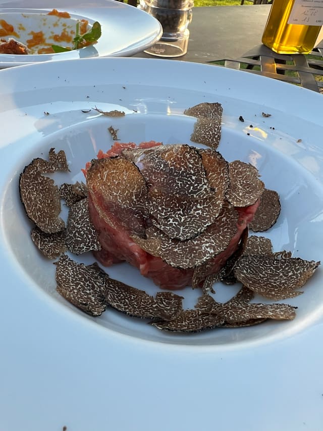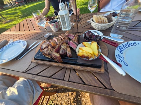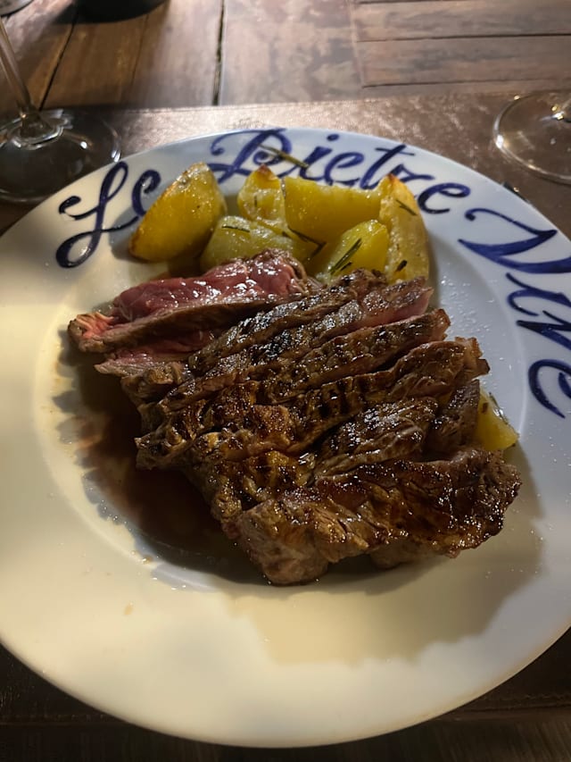6.5/10Food was ok but disappointing considering the high marks this restaurant gets and considering the usually high standards of Tuscan cuisine: the steak overcooked, pasta all chitarra swimming in oil . The stinco (shank) of pork was delicious but a little dry and too little sauce. The pasta with broccoli, anchovies and pecorino cheese was the best dish and faultless. Another small issue: the Parking lot in the middle of an unpaved, uneven and unlit field approx. 100 m from the beautiful main building hence still quite a distance to walk on such an uneven terrain with no sign posted walkway to the restaurant. So don’t take your nicest shoes out for dinner.