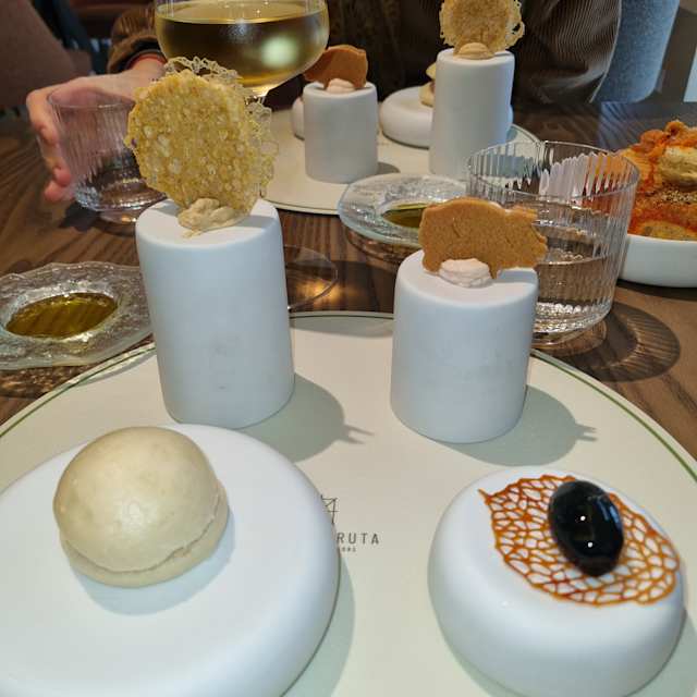 - Sfere liquide di caramello salato e arachidi, cremoso alla vaniglia, sorbetto passion fruit, gelatina di menta e passion fruit, cialda al caramello