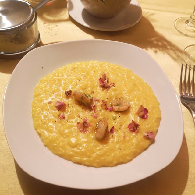 Risotto alla zafferano con gamberi scottati al profumo di rosa