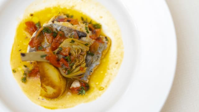 Merluzzo carbonaro in olio cottura, crema di latte e acciughe e olio al prezzemolo