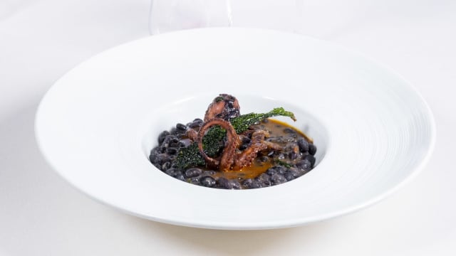 Moscardini in umido, croccante di mais giallo e sfere di peperoncino
