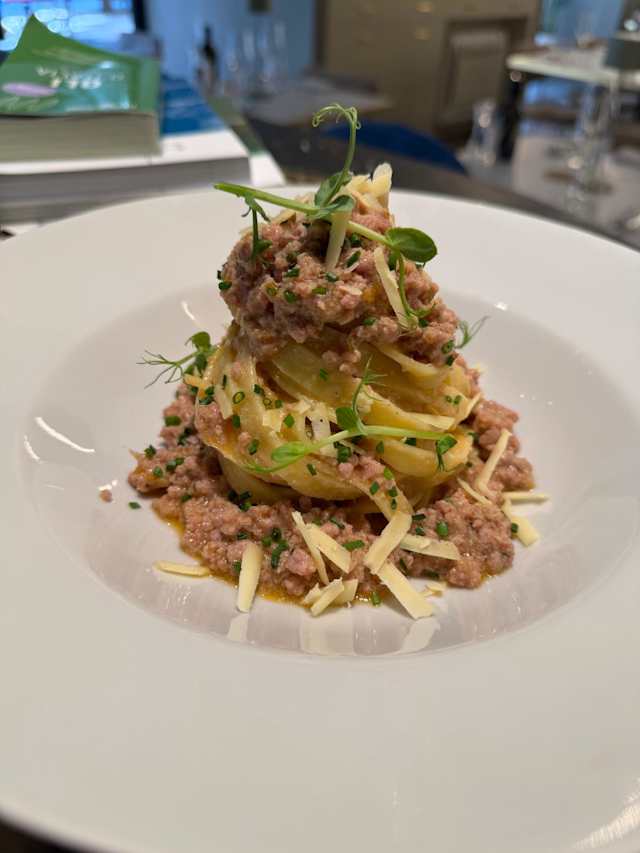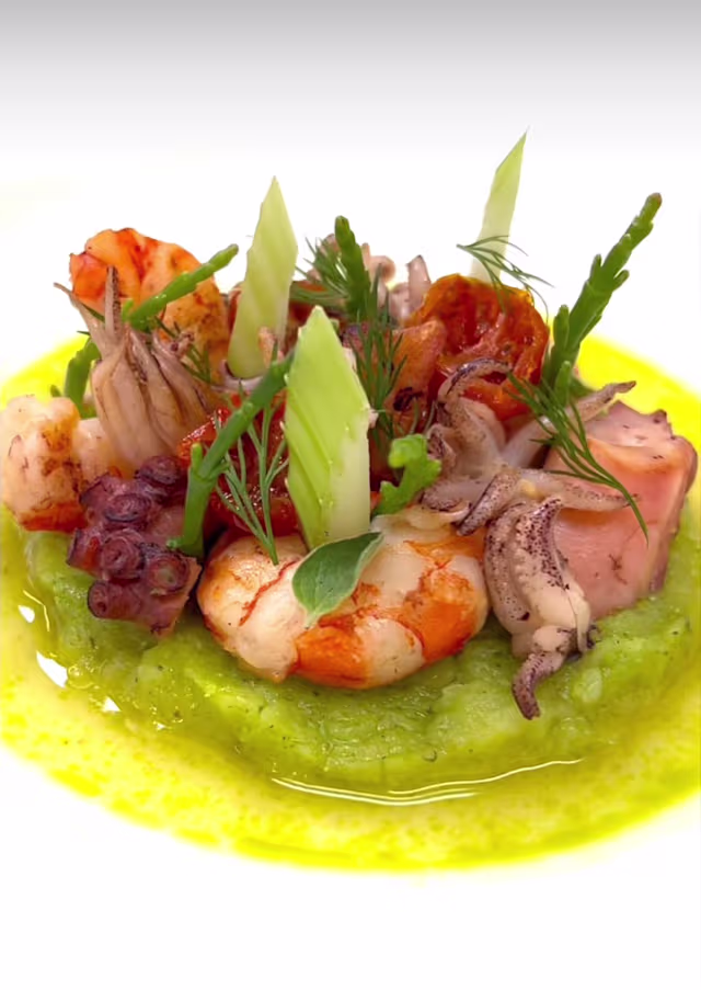 - "Polpo scottato, stracciatella crema di pistacchio, cipolla rossa fritta"