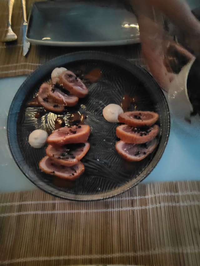 Good food nicely presented. Nice place on the roof of the hotel providing a nice view. Waiter really amable and friendly. A nice place to go and eat.