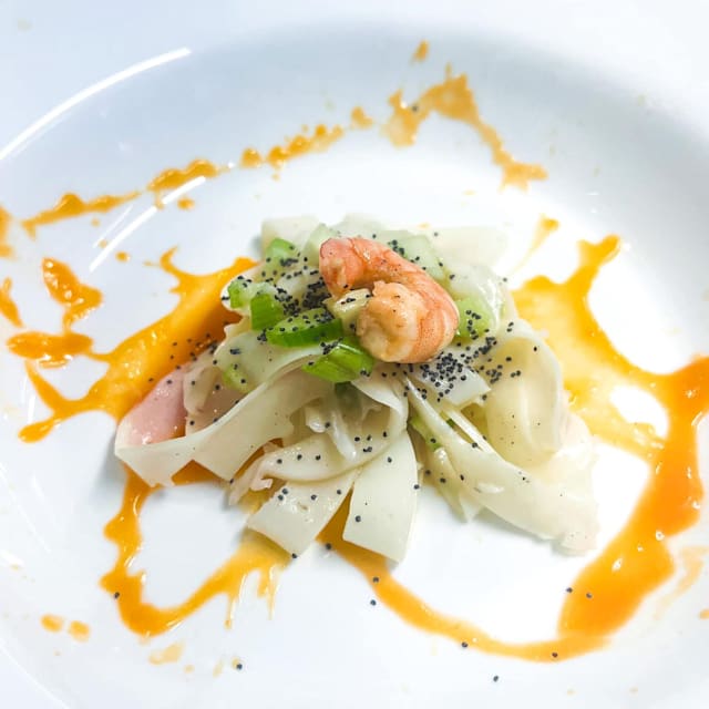 - Tagliatelle di seppia cotte a bassa temperatura servita con verdure croccanti pomodorini mazzancolle al vapore e citronet di lime