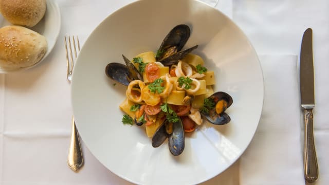 Linguine con vongole veraci, cozze, calamari, gamberoni**, scampi** e pomodorini siciliani