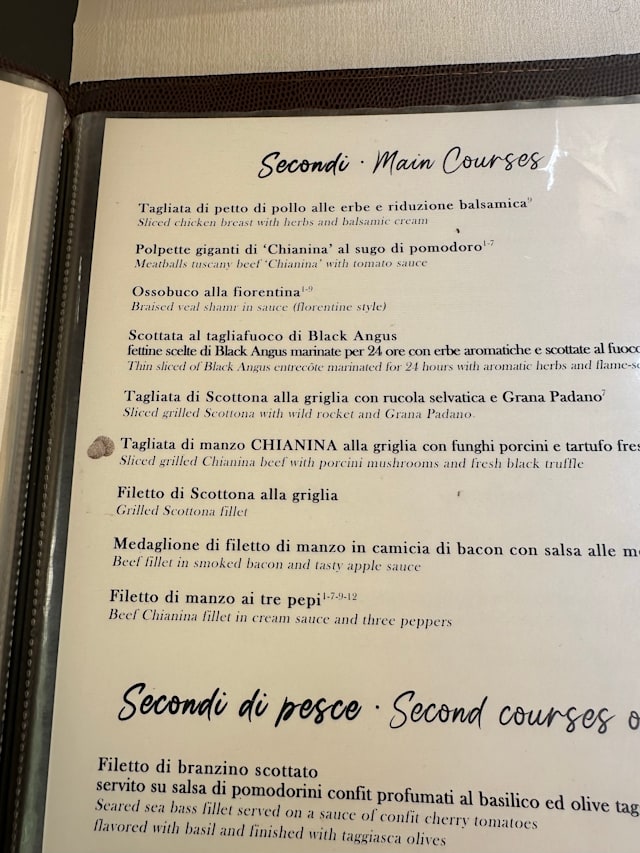 6.5/10We came here because it was rated high for offering the top Florentine steak (Bistecca Florentine Chianina IGP). I ordered the top grade of meat. Maybe my expectations were too high. The meat was dry and not flavorful. The presentation of the steak was excellent and makes for great pictures. Taste is subjective, but wagyu A5 is still world’s best.