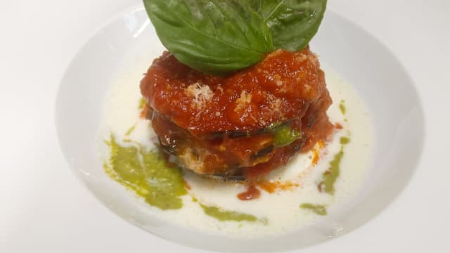 Parmigiana di melanzane con crema di mozzarella e basilico e spolverata di grana