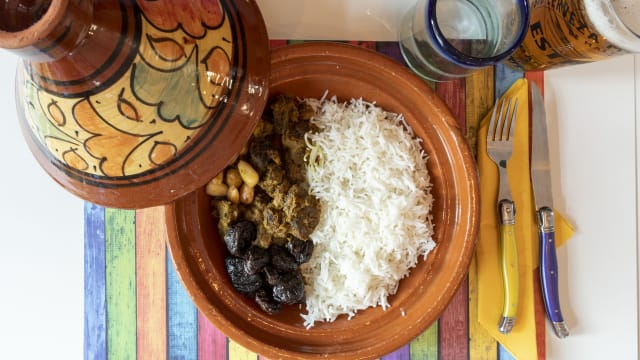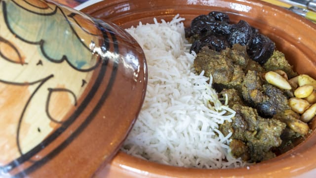 Bocconcini di manzo con datteri, cipolla, albicocca secca, uva secca, prugne secche, curcuma servito con riso basmati