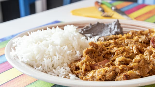 Piatto a base di carne di maiale, pollo, chorizo, cipolla e chile chipotle. Molto piccante.Servito con riso, crema di fagioli e 4 tortillas di mais