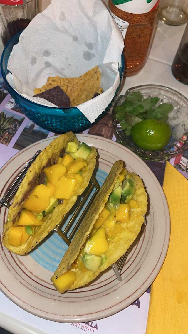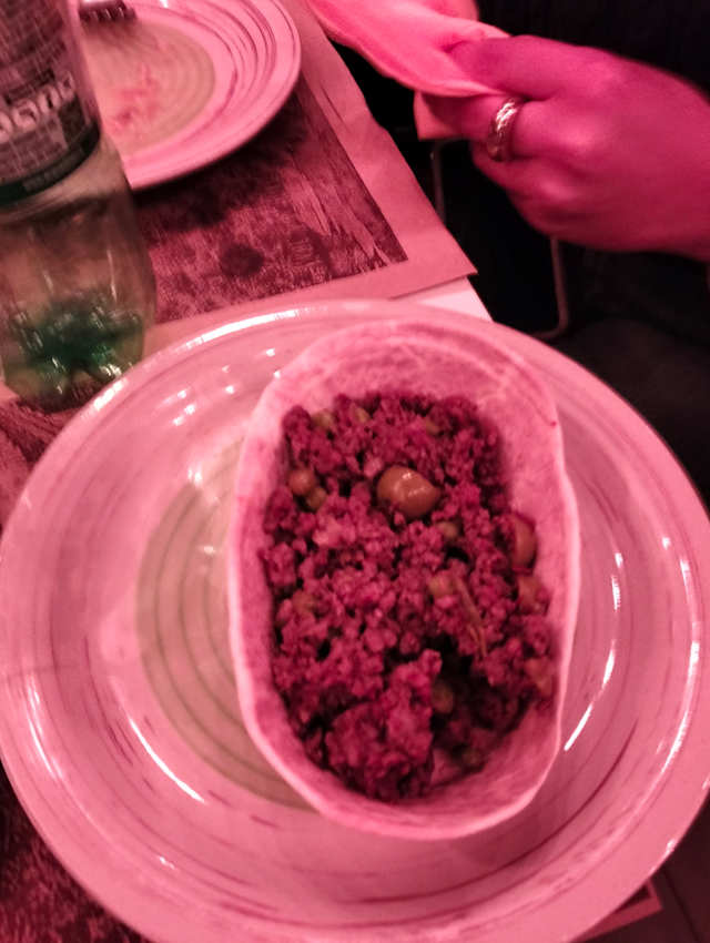 Tortilla ripiena di carne e salsa a base di pomodori, cipolla, peperoncino e coriandolo fresco piccante medio.Servito con riso, crema di fagioli