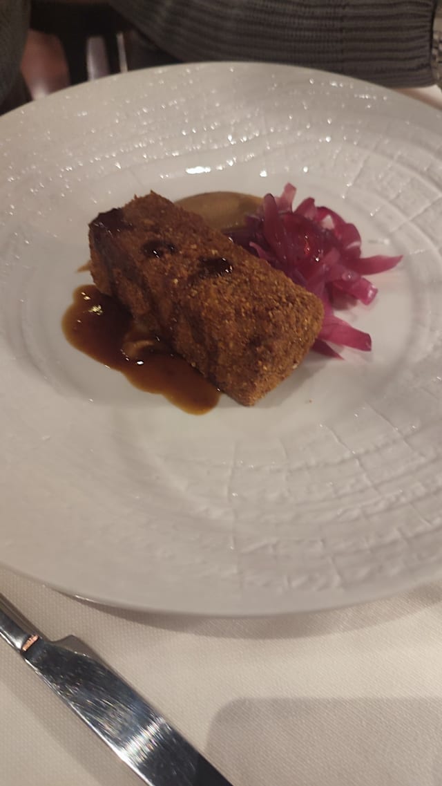 Spalla di maialino da latte cotta e stracotta poi sfilacciata e impanata alla milanese cipolle rosse al sale e mele renetta