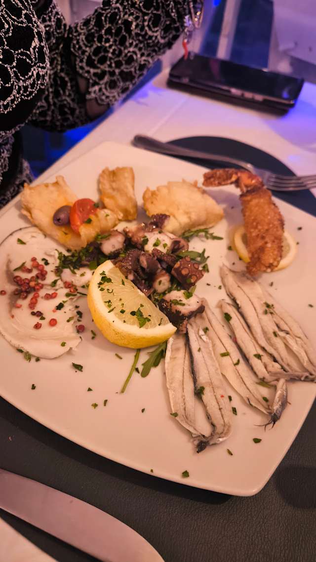 - Salmone norvegese affumicato, pesce spada marinato, polpo all'insalata, gambero pastellato alle mandorle, baccala fritto, arancino di mare