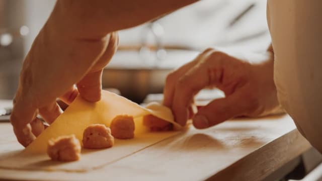Cappelletto a fiore ripieno di scorfano, pesto fatto in casa, acqua di pomodoro