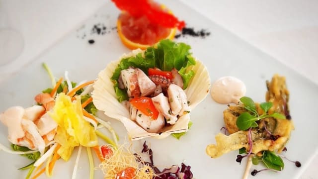 Insalata di mare con seppia, calamari, moscardini, gamberetti, polpo patate e pomodorini, cocktail gamberetti, sashimi di salmone, tartare di tonno, cocktail di gamberetti