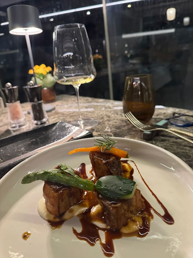 6/10Stunning view and good food, but chaotic service ruined the experience. Despite being the first seated for our 8:15 reservation, wine didn’t arrive until just before our first course. Staff seemed uncoordinated, with no clear leadership. Our water was placed out of reach, and refills were nearly impossible to get. After dessert, it took over 25 minutes and asking five different people—including a manager—for our bill before it finally arrived. Only the hostess showed urgency and professionalism. For a 700-euro dinner, the lack of basic service was unacceptable. If you go, enjoy the view—but don’t expect smooth service unless you’re staying at the hotel.