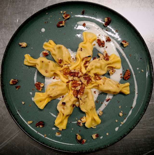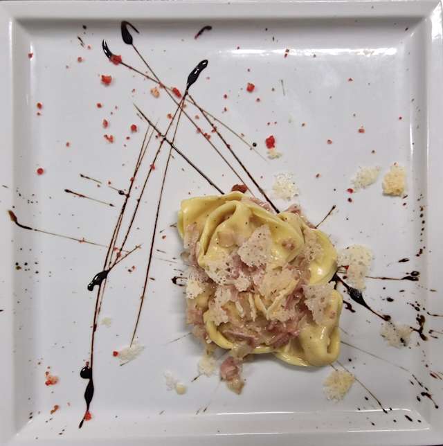 - Tortelli di ricotta fresca "del casaro" su fonduta di parmigiano reggiano е spinacino fritto