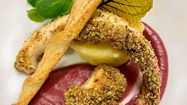 Gnocco alla romana grigliato con baccalà mantecato e sfere di sfoglia con branzino in salsa mantovana.