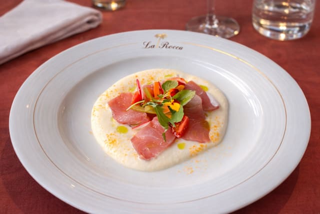 - Tartare di manzo battuta al coltello, salsa carbonara, limone bruciato