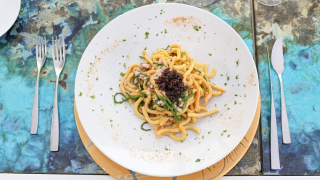 - Passatelli asciutti spada, asparagi di mare, uovo di lompo