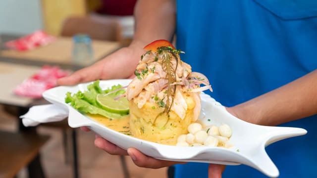 Pesce crudo e frutti di mare marinati nel succo di lime, cipolla, peperoncino e coriandolo, accompagnati da patata dolce e mais.