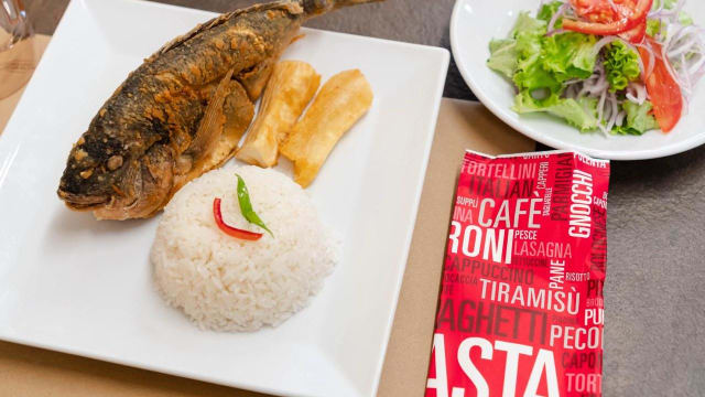 Pesce fritto con riso, manioca e salsa di cipolla.