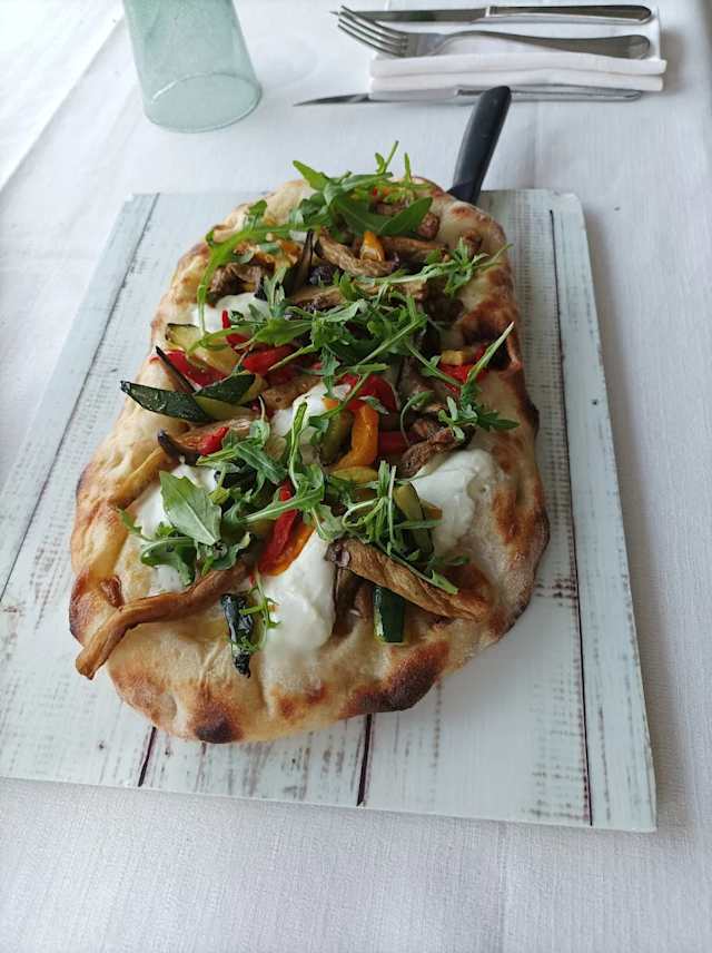 - 2 Calamari and 2 prawn skewers flavoured with herb breadcrumbs and accompanied by sautéed vegetables (a trio of chard, spinach and chicory)