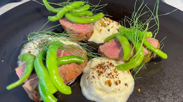 Su croccante al sesamo nero, caprino, passion fruit e cappero