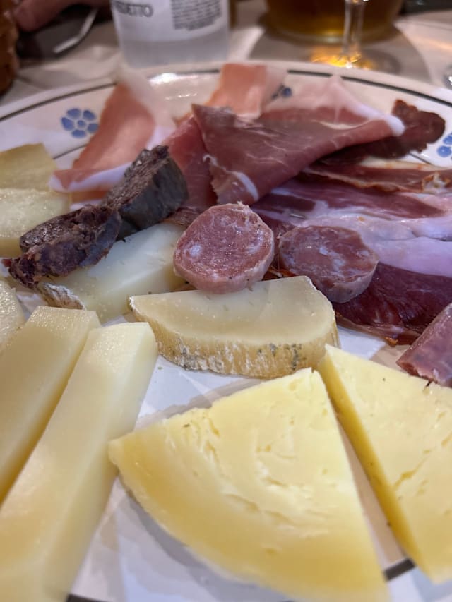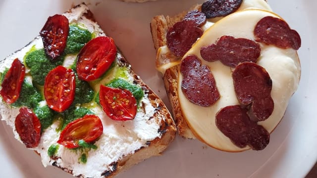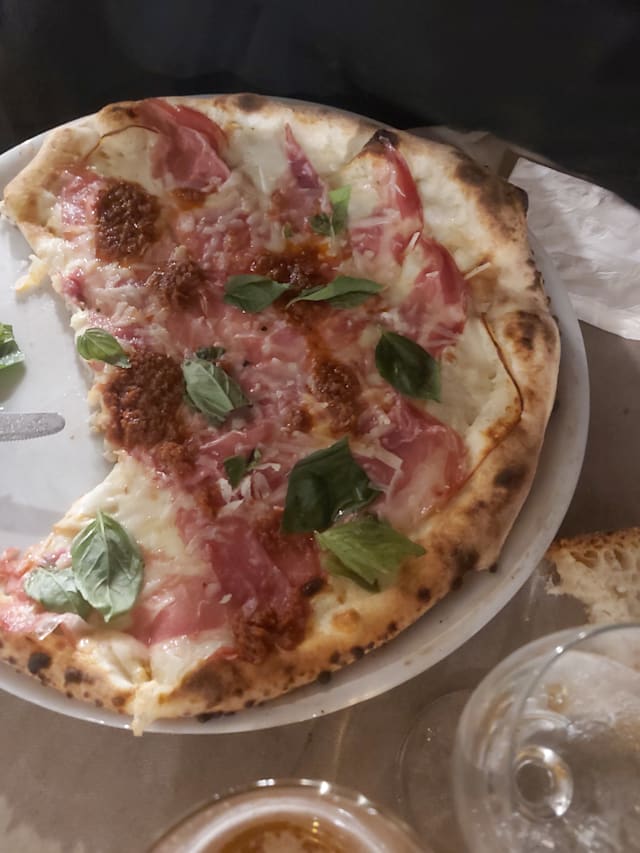 pomodoro fresco a rondelle, mozzarella fior di latte, prosciutto crudo di Parma e rucola.