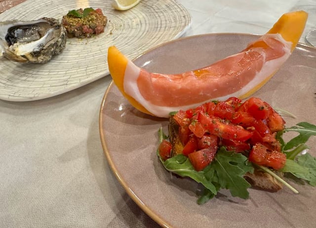 Insalata di polpo con patate, insalata di calamari con pomodoro fresco e olive, insalata di gamberi con patate e olive verdi, tartara di tonno con pistacchio e capperi, ostriche e alici marinate, bruschetta con pomodoro e rucola, prosciutto crudo e melone.
