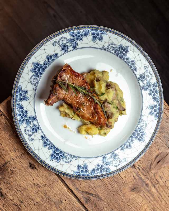 - Alla faraona servite con porro croccante e formaggio vezzena