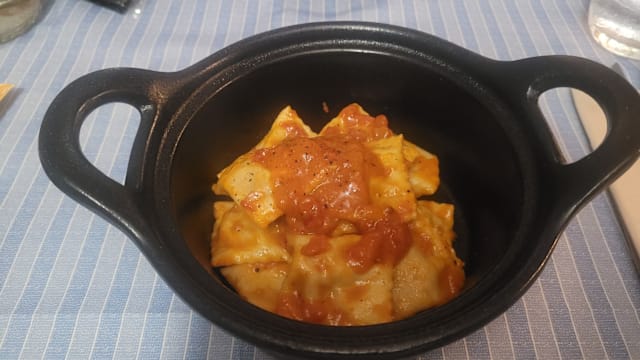 - Ravioli di mazzancolle e salmone con burro chiarificato all’erba cipollina