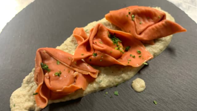 Tortello ripieno di gambero rosso e stracciatella di burrata alla besciamella rosé e lamelle di mandorle tostate